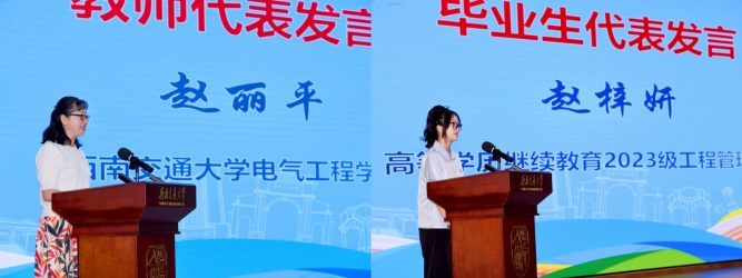 教師代表電氣工程學(xué)院趙麗平副教授祝賀同學(xué)們順利畢業(yè),并分享了同學(xué)們在克服工學(xué)矛盾、堅持學(xué)習(xí)中點點滴滴的感人故事,期望同學(xué)們帶著這份在課堂上重新點燃的熱情,生命不息,學(xué)習(xí)不止;終身學(xué)習(xí),終身受益。