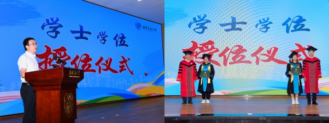 溫朋宣讀《西南交通大學(xué)2024至2025學(xué)年繼續(xù)教育學(xué)士學(xué)位授予學(xué)生名單》,康國政教授和陳民武教授逐一為獲得學(xué)士學(xué)位學(xué)生代表撥穗正冠、頒發(fā)學(xué)位證書。